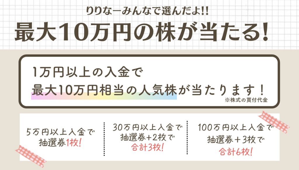 口座開設+入金で抽選に参加できるキャンペーンなので、株の売買をするのがちょっと不安な初心者さんも参加しやすいです♪