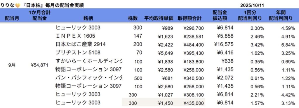 9月は、配当目的の株と優待目的の株から配当が入りました。