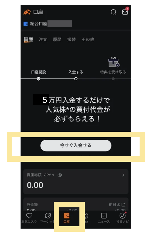 最後、アプリの下部メニュー「口座」に戻り、「今すぐ入金する」をタップします。