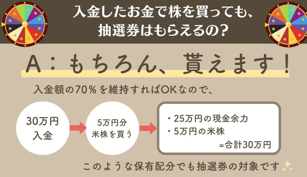 入金額に応じて抽選券が貰えて、抽選に参加することで株(の買付代金)が当たり、人気株と交換できる。という流れですっ!