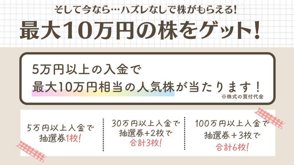 口座開設+入金で抽選に参加できるキャンペーンなので、株の売買をするのがちょっと不安な初心者さんも参加しやすいです♪