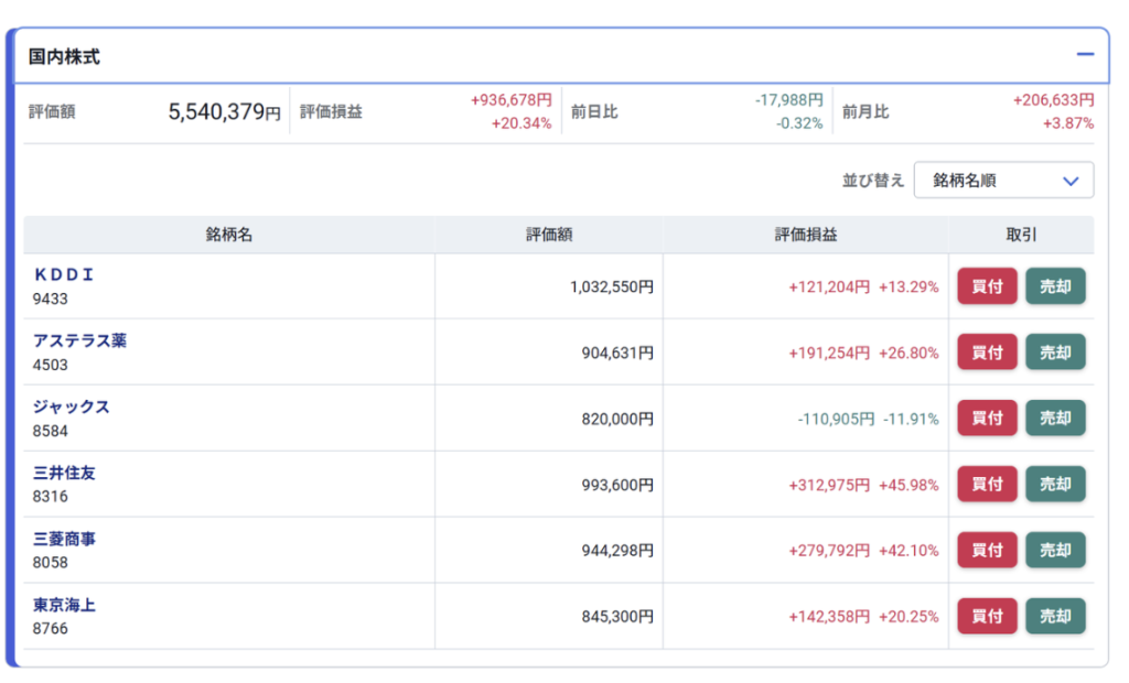 KDDI、アステラス、ジャックス、三井住友FG、三菱商事、東京海上。この6銘柄へ投資しています。