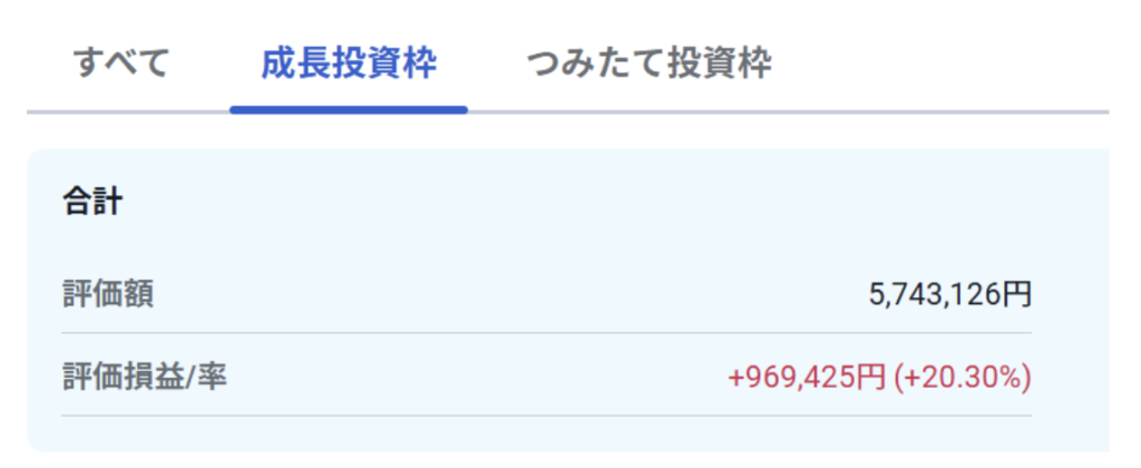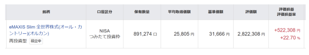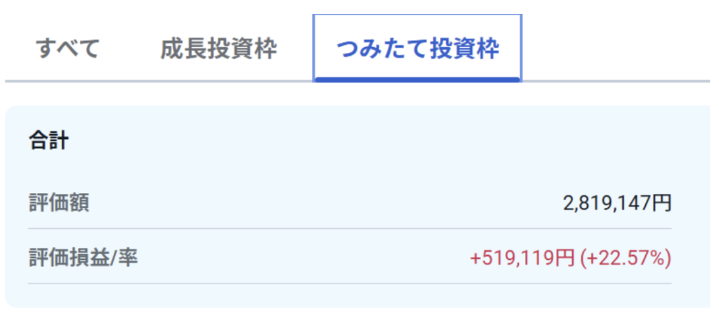 それでは、口座ごとの損益状況を紹介していきます。まずは夫名義のつみたて投資枠から!