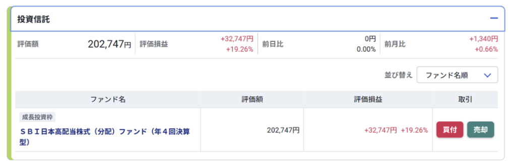 成長投資枠は日本株の高配当銘柄へ投資をしたかったので、SBI日本高配当株式ファンドを選びました。