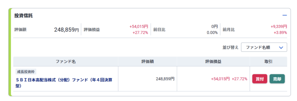 成長投資枠は日本株の高配当銘柄へ投資をしたかったので、SBI日本高配当株式ファンドを選びました。